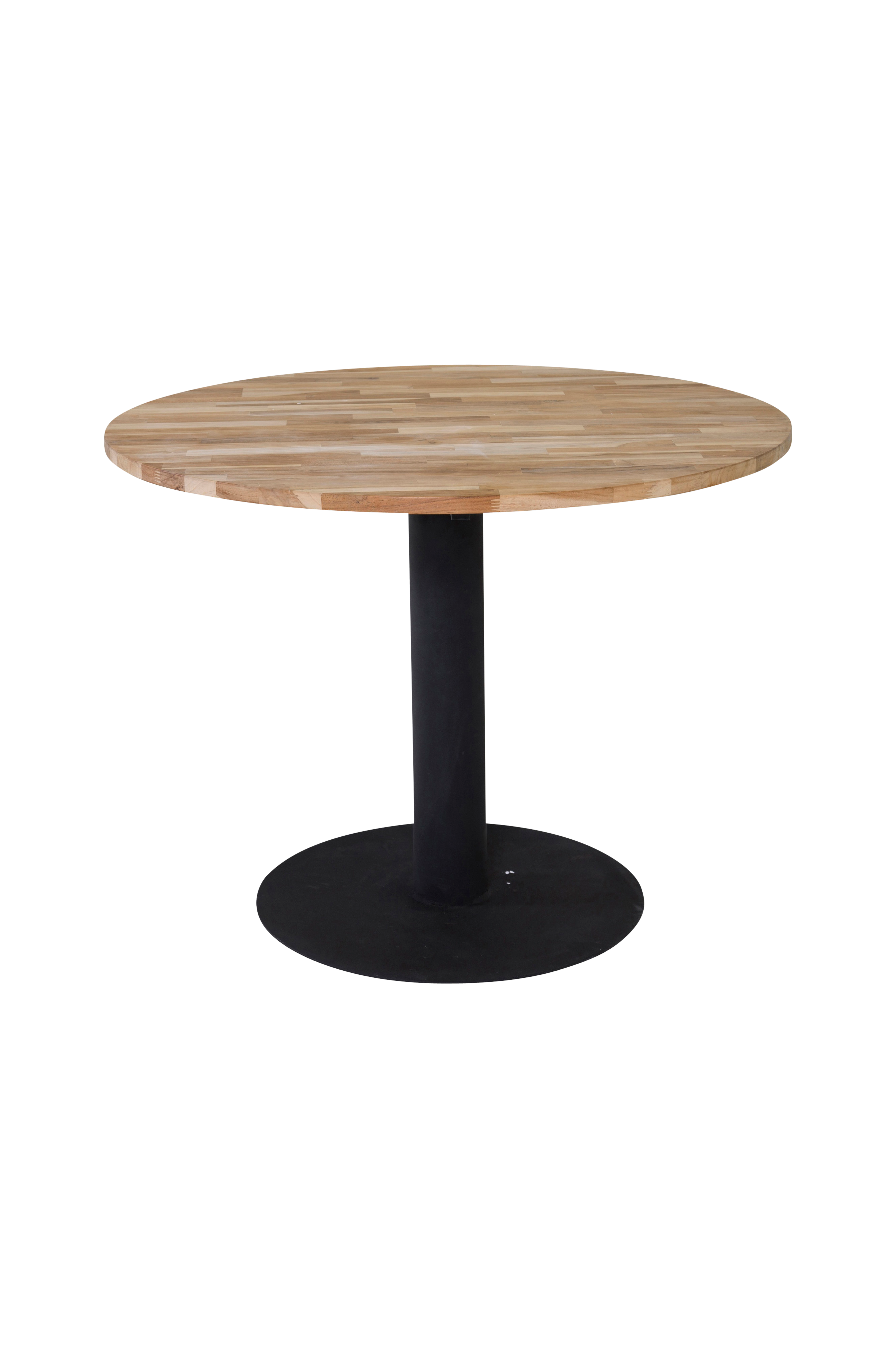 Camille-ruokapöytä, jossa pöytälevy sauvaliimattua tiikkiä ja metallijalat. Halkaisija 140 cm. Pöytä on helppo koota.