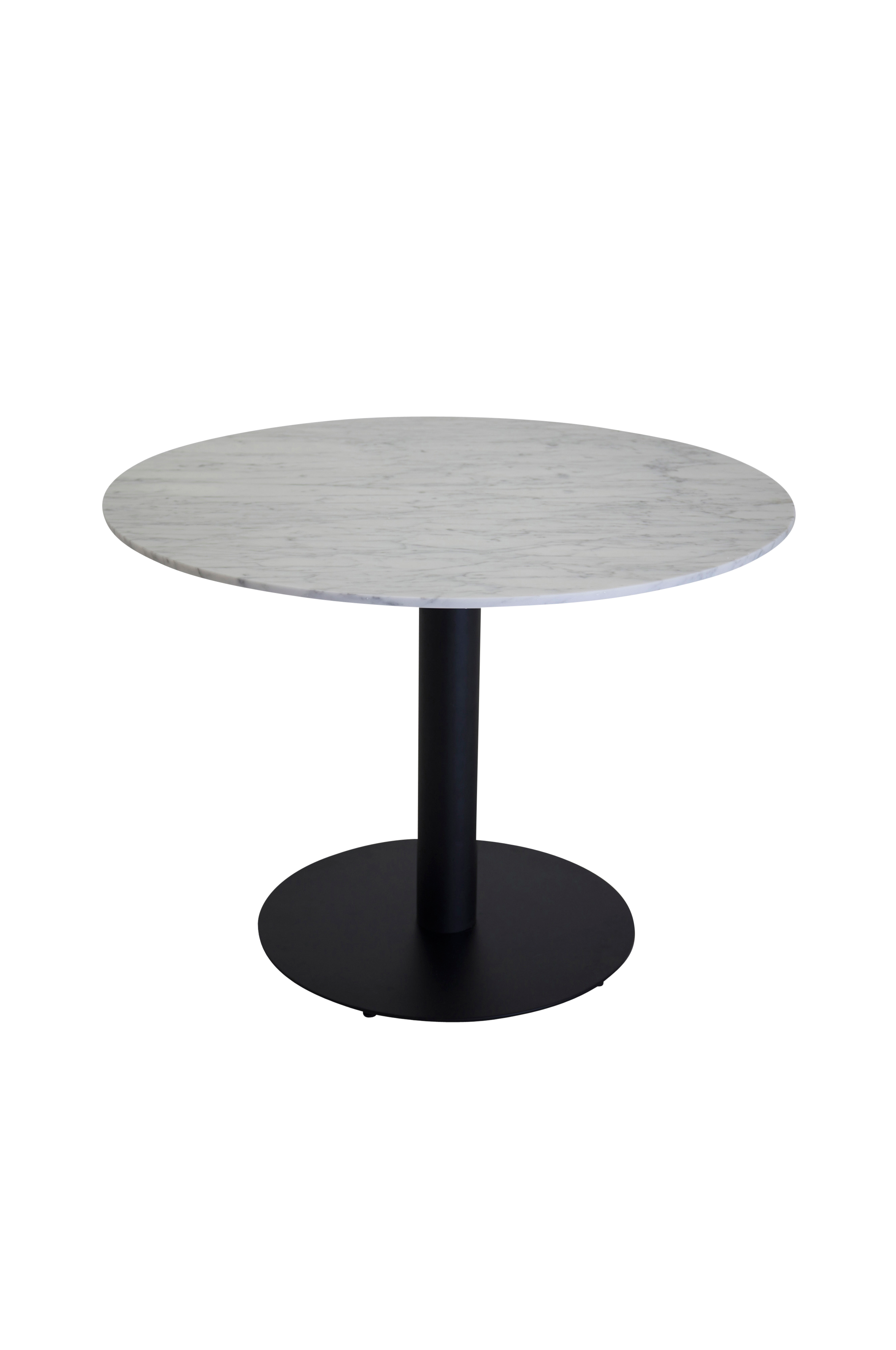 Pyöreä Estelle-ruokapöytä. Moderni ruokapöytä, jossa ylelliset materiaalit. Pöytälevy on aitoa marmoria ja jalusta metallia. Halkaisija: 106 cm Korkeus: 75 cm. Koottava.
