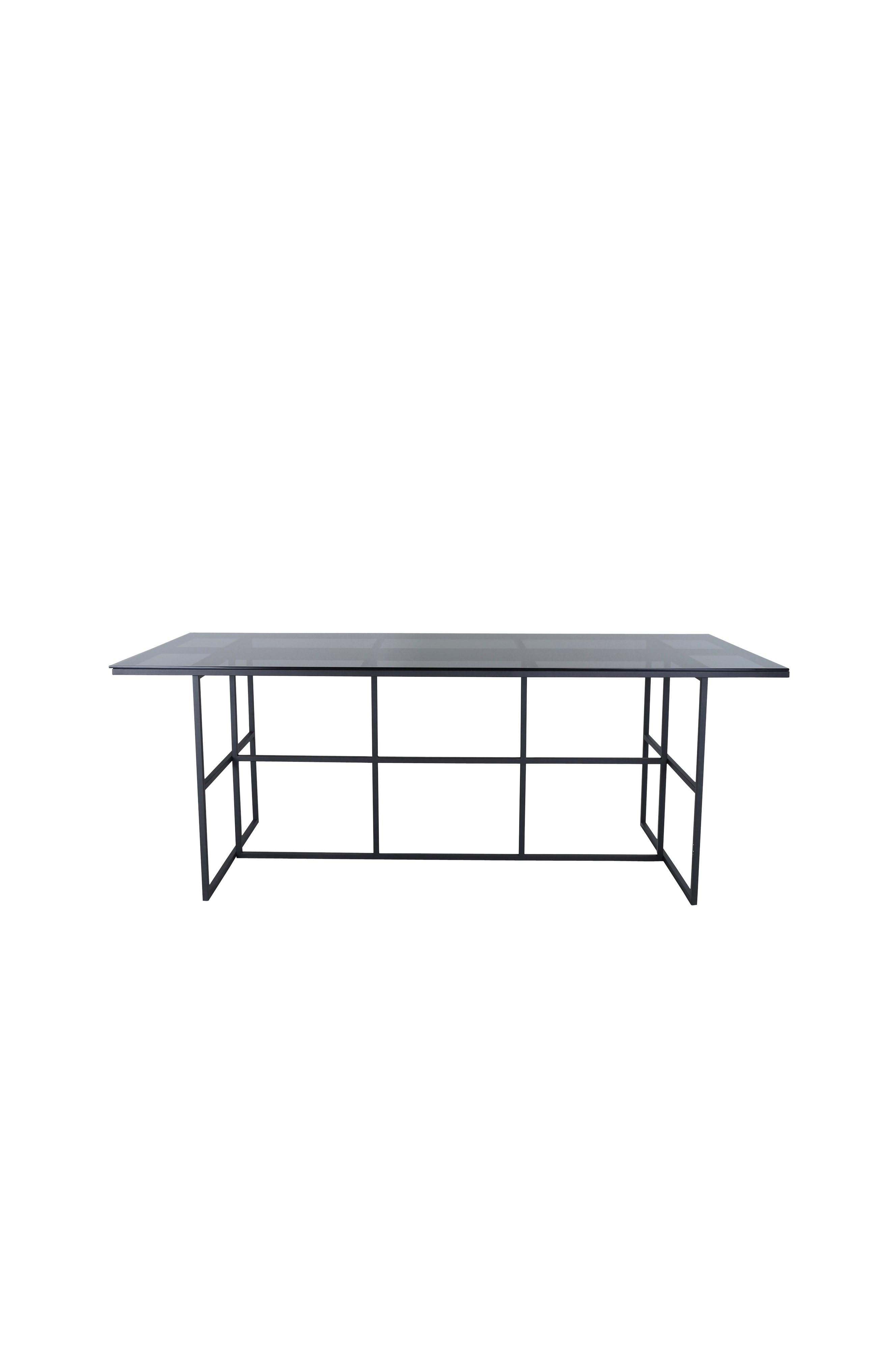 Suorakaiteenmuotoinen Leif-ruokapöytä, jossa pöytälevy savunväristä lasia ja jalat metallia. Pöydän mitat: Pituus: 200 cm, leveys: 90 cm, korkeus: 74 cm. Pöytä on helppo koota.