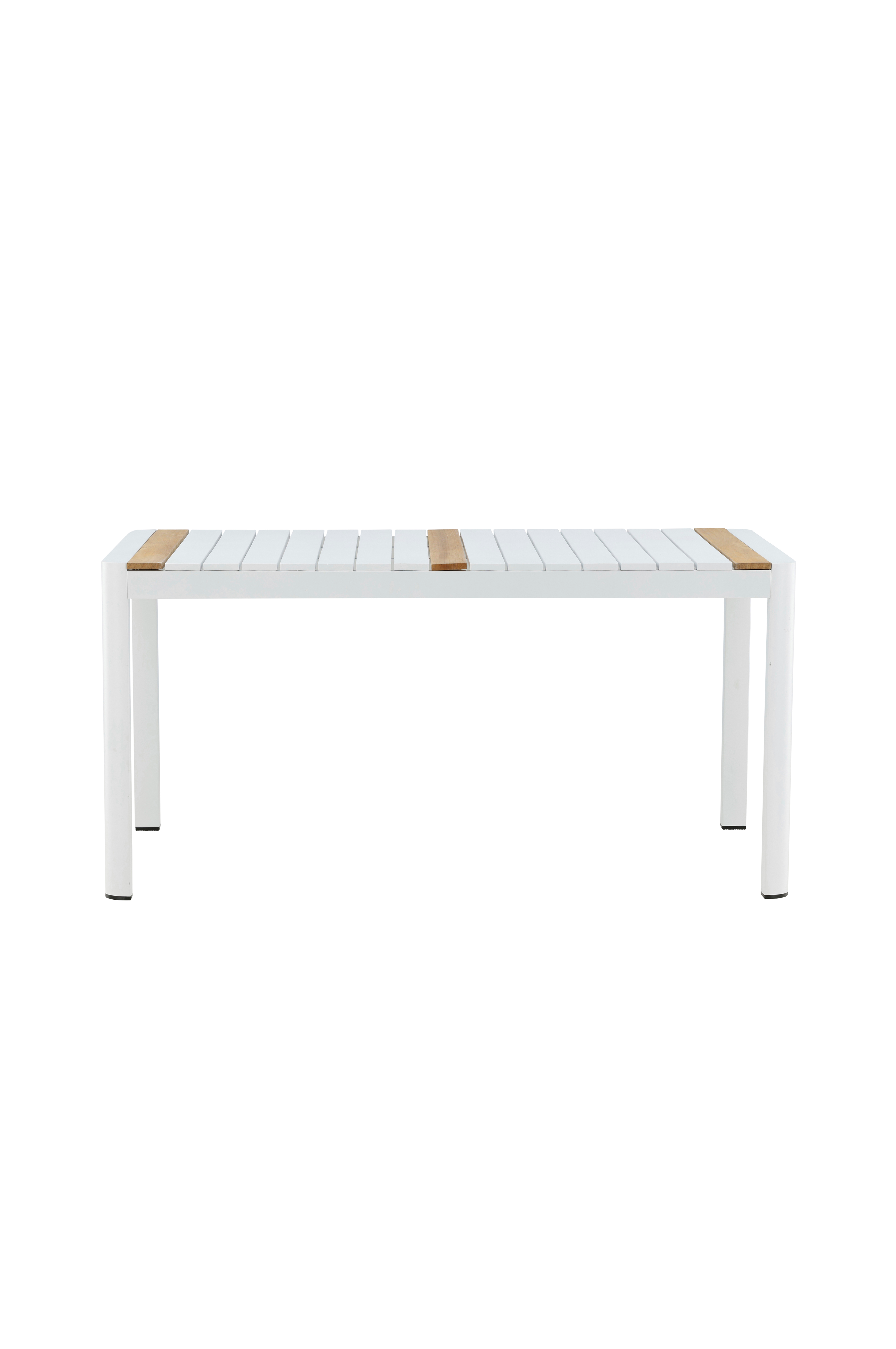 Togo-ruokapöytä, jossa soikea alumiinipöytälevy ja tiikkiset yksityiskohdat. Alumiinijalat. Pöytä on helppo koota. Pöydän mitat: Pituus: 150 cm, leveys: 90 cm, korkeus: 75 cm.