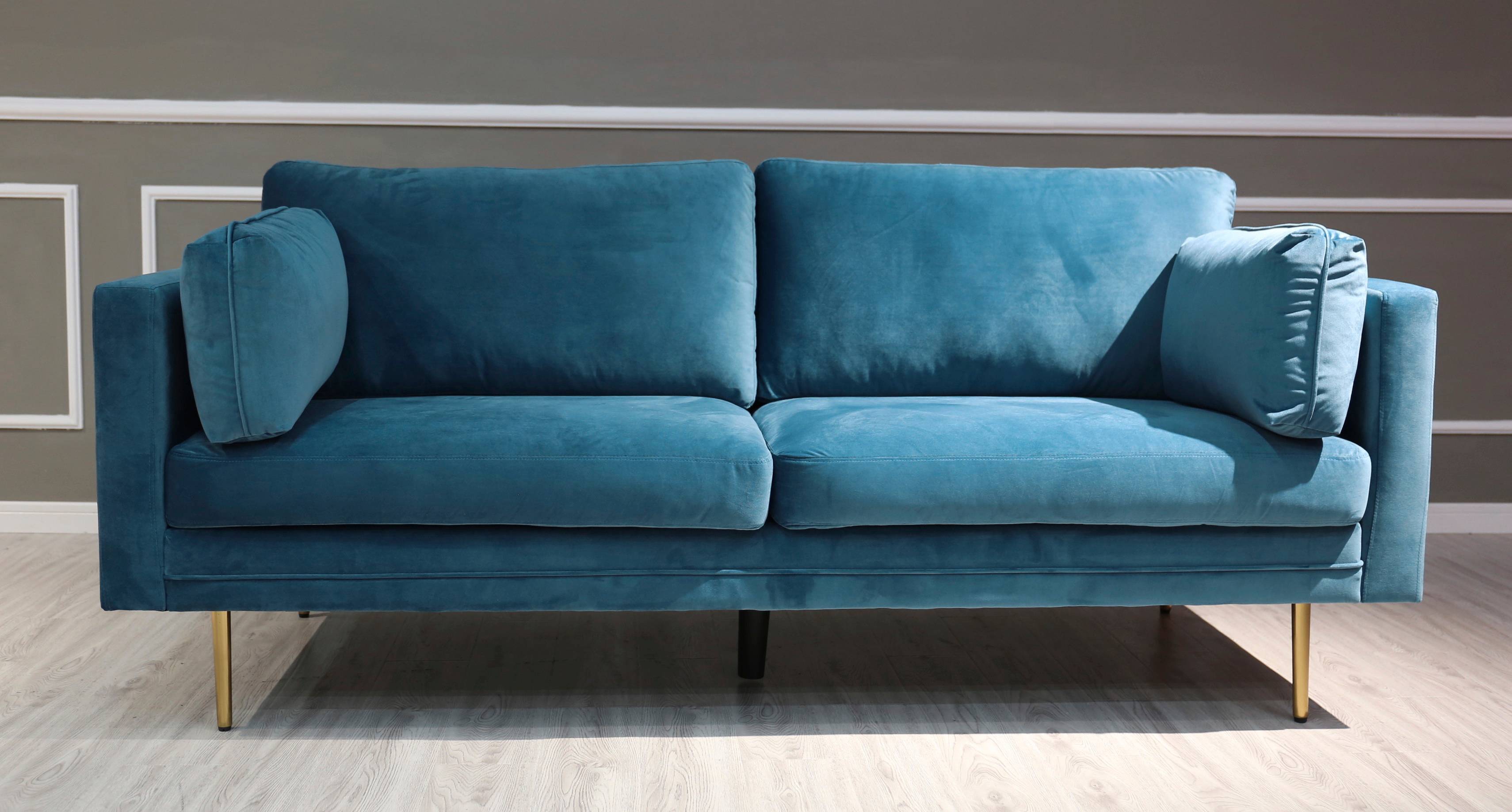 3:n istuttava samettisohva, jossa metallijalat. Puurunko ja istuin, jossa nozag-jouset ja vaahtomuovia. Martindale-arvo > 10 000. Istuinleveys 181 cm. Etäisyys lattiasta käsinojaan 70 cm. Jalkojen korkeus 20,5 cm. Istuinpehmusteiden paksuus 15 cm, selkäpehmusteiden 20,5 cm. Asenna jalat itse.