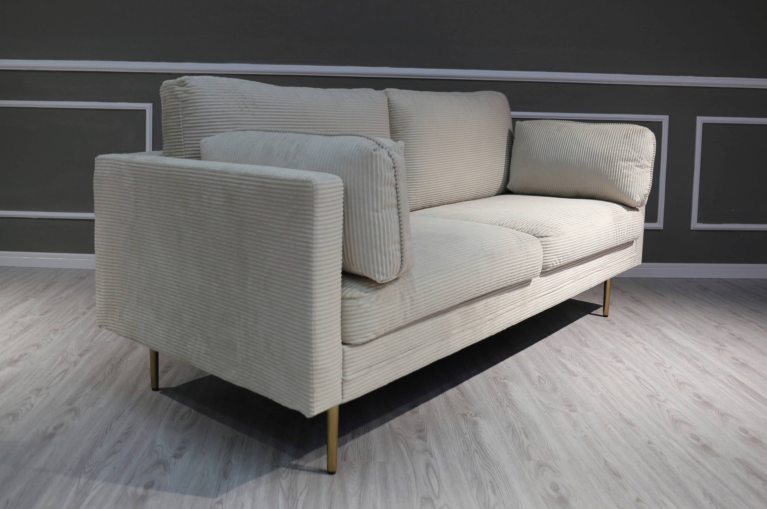 3:n istuttava sohva vakosamettia. Metallijalat. Puurunko ja istuin, jossa nozag-jouset ja vaahtomuovia. Martindale-arvo > 10 000. Istuinleveys 181 cm. Etäisyys lattiasta käsinojaan 70 cm. Jalkojen korkeus 20,5 cm. Istuinpehmusteiden paksuus 15 cm, selkäpehmusteiden 20,5 cm. Asenna jalat itse.