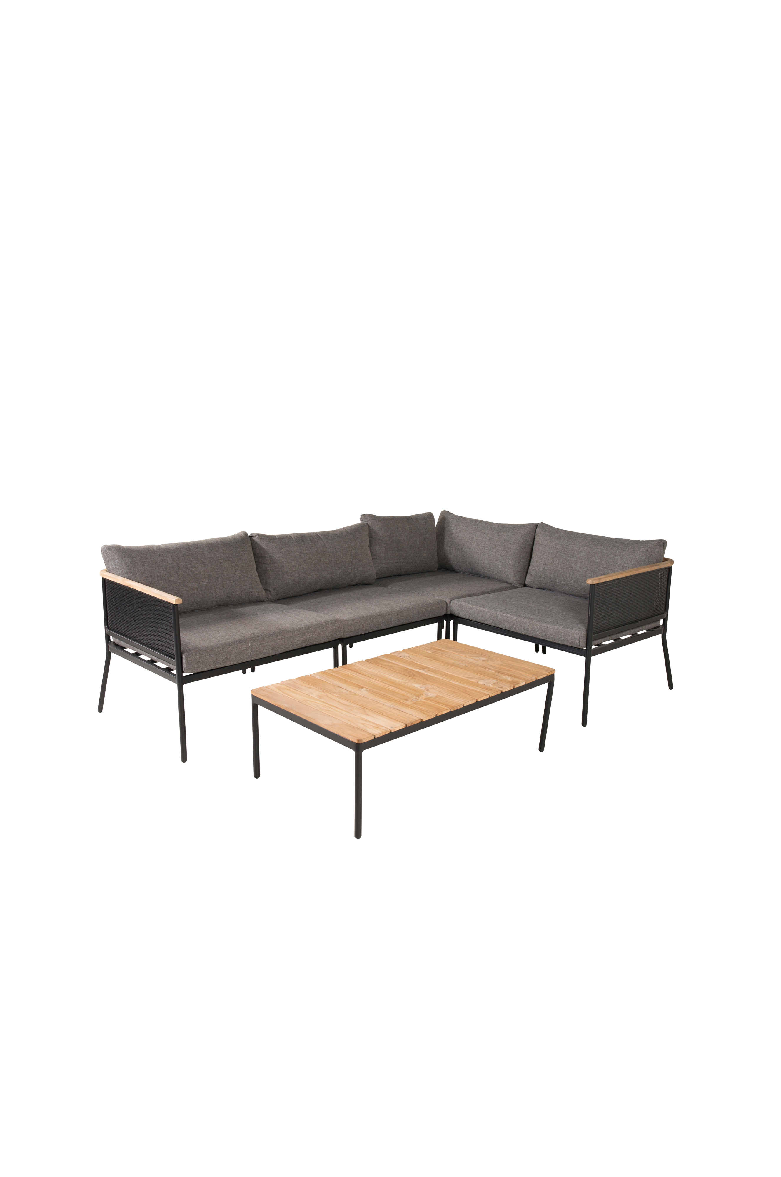 Namiba-sohvaryhmä metallia ja terästä. Ryhmään kuuluu 1 kulmasohva (3+1) ja 1 sohvapöytä. Sohvaryhmään mahtuu istumaan 5 henkeä. Pöydän mitat: Korkeus: 35 cm, leveys: 60 cm, pituus: 106 cm. Sohvan mitat: Korkeus: 66/66/66 cm, leveys: 226 cm, pituus: 80/80/80 cm. Istuinkorkeus: 35/35/35 cm, istuinleveys: 77/70/68 cm, istuinsyvyys: 70/70/70 cm. Pehmuste mukana.