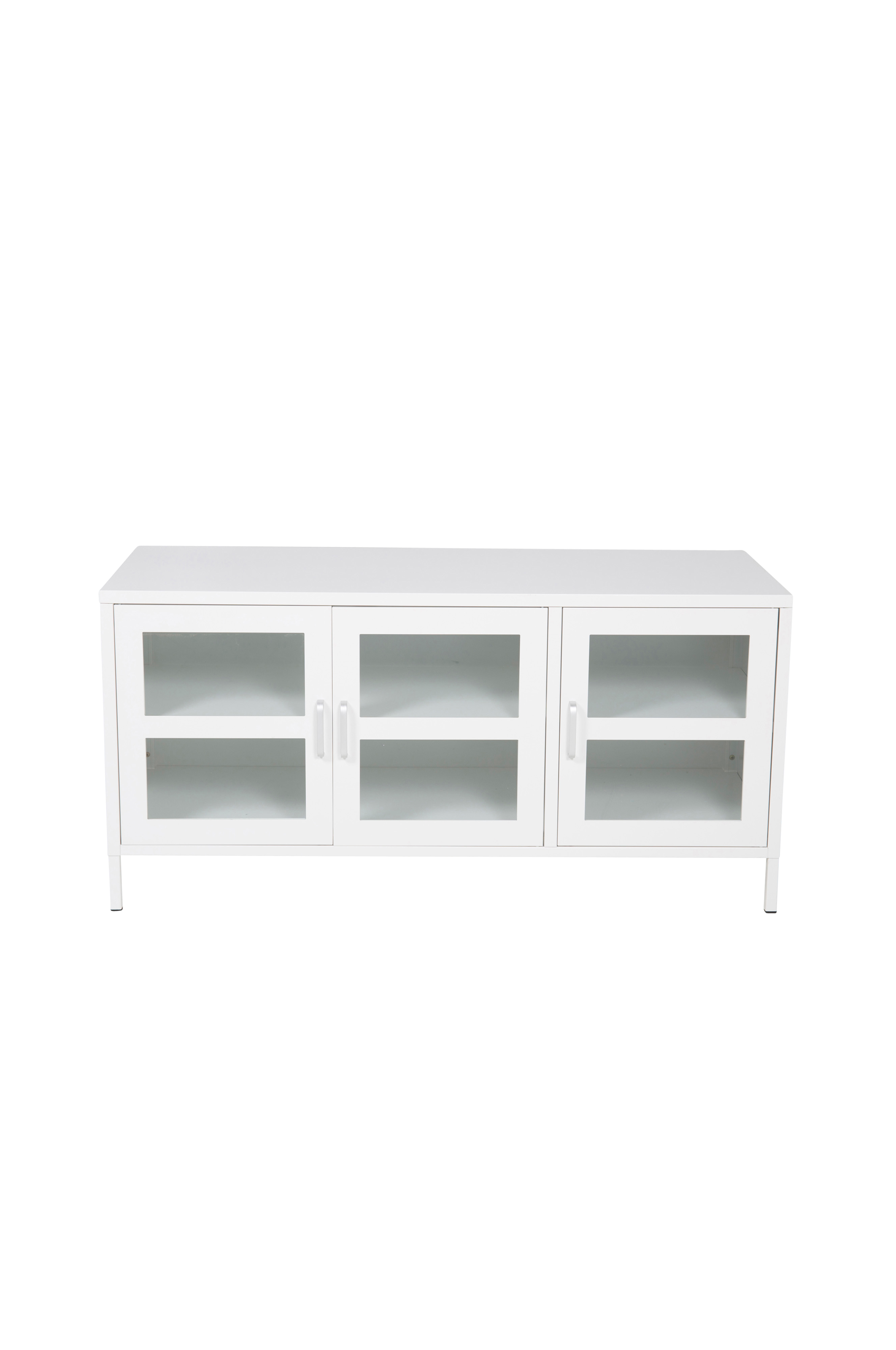 Aciel-TV-taso terästä. Kolme lasiovea, joiden läpi näet mitä kaapissa on. Kauniit hopeanväriset kahvat. 48 x 120, korkeus 58 cm. Koottava.