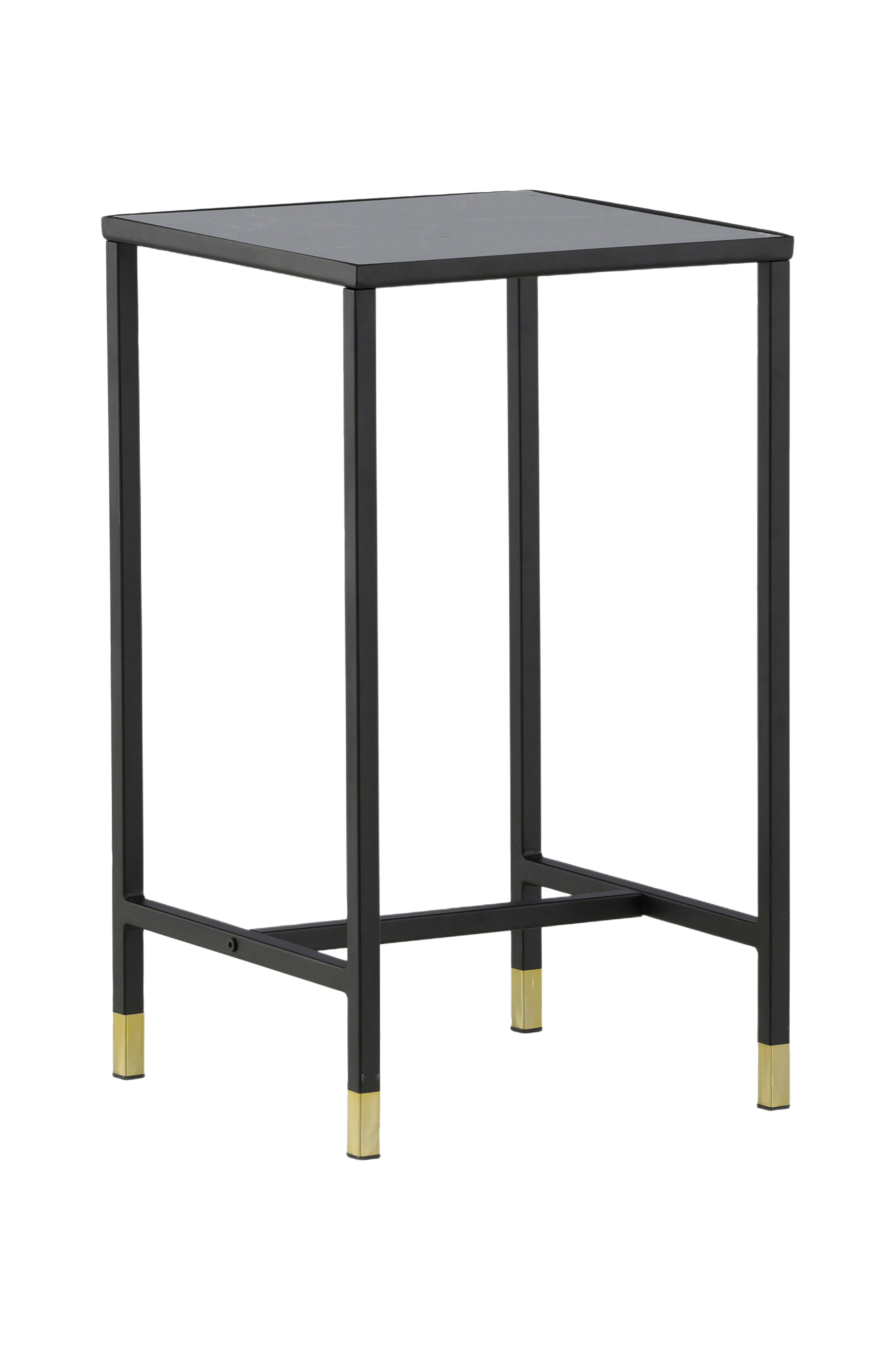 Nelikulmainen sivupöytä, jonka ylellinen pöytälevy marmorin näköistä lasia. Mustat metallijalat, joiden alaosassa tyylikäs yksityiskohta harjattua messinkiä. Leveys: 40 cm Korkeus: 70 cm Pituus: 40 cm Helppo koota.