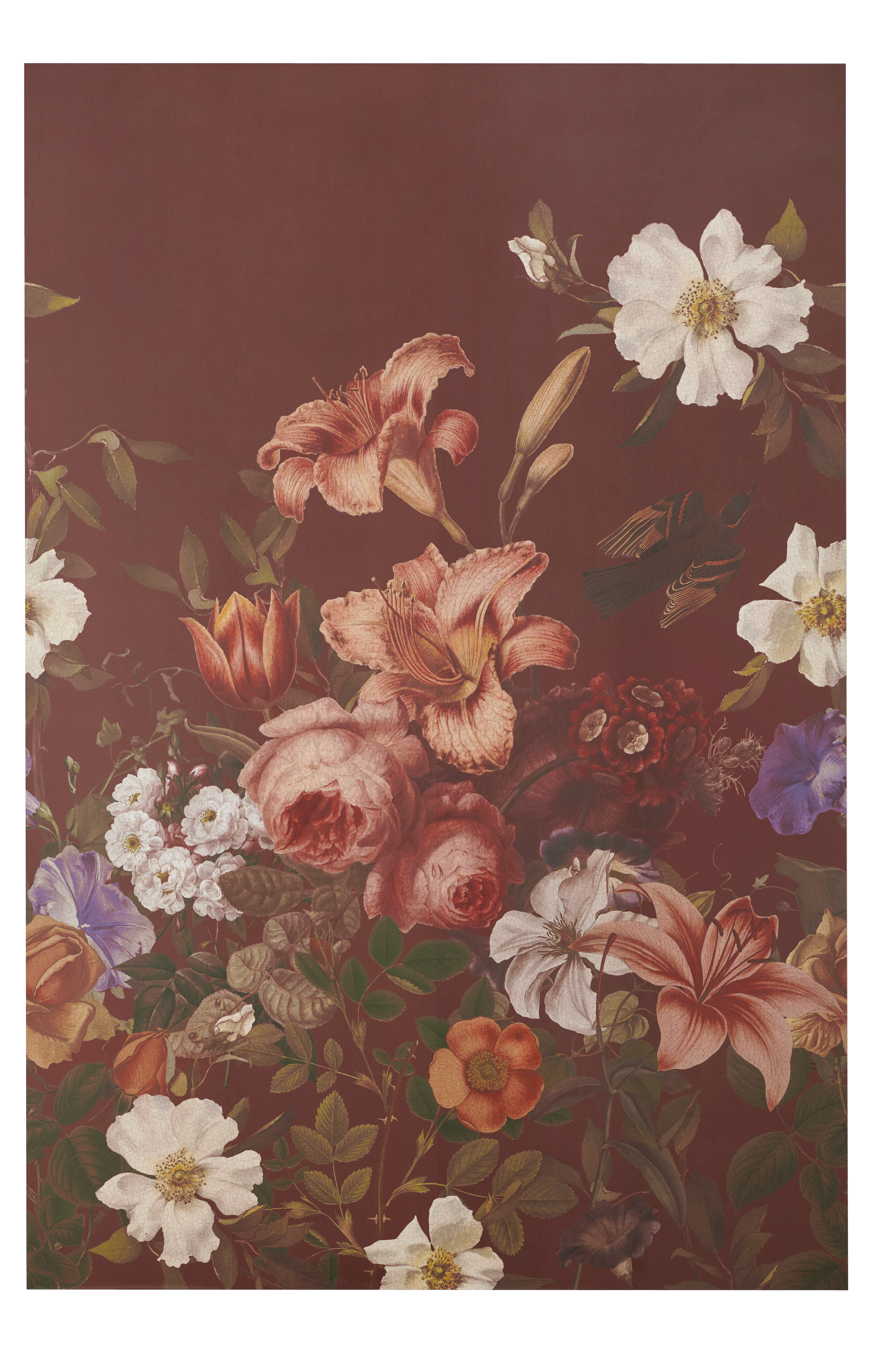 Statement Floral -tapettinäyte, tumma viininpunainen.