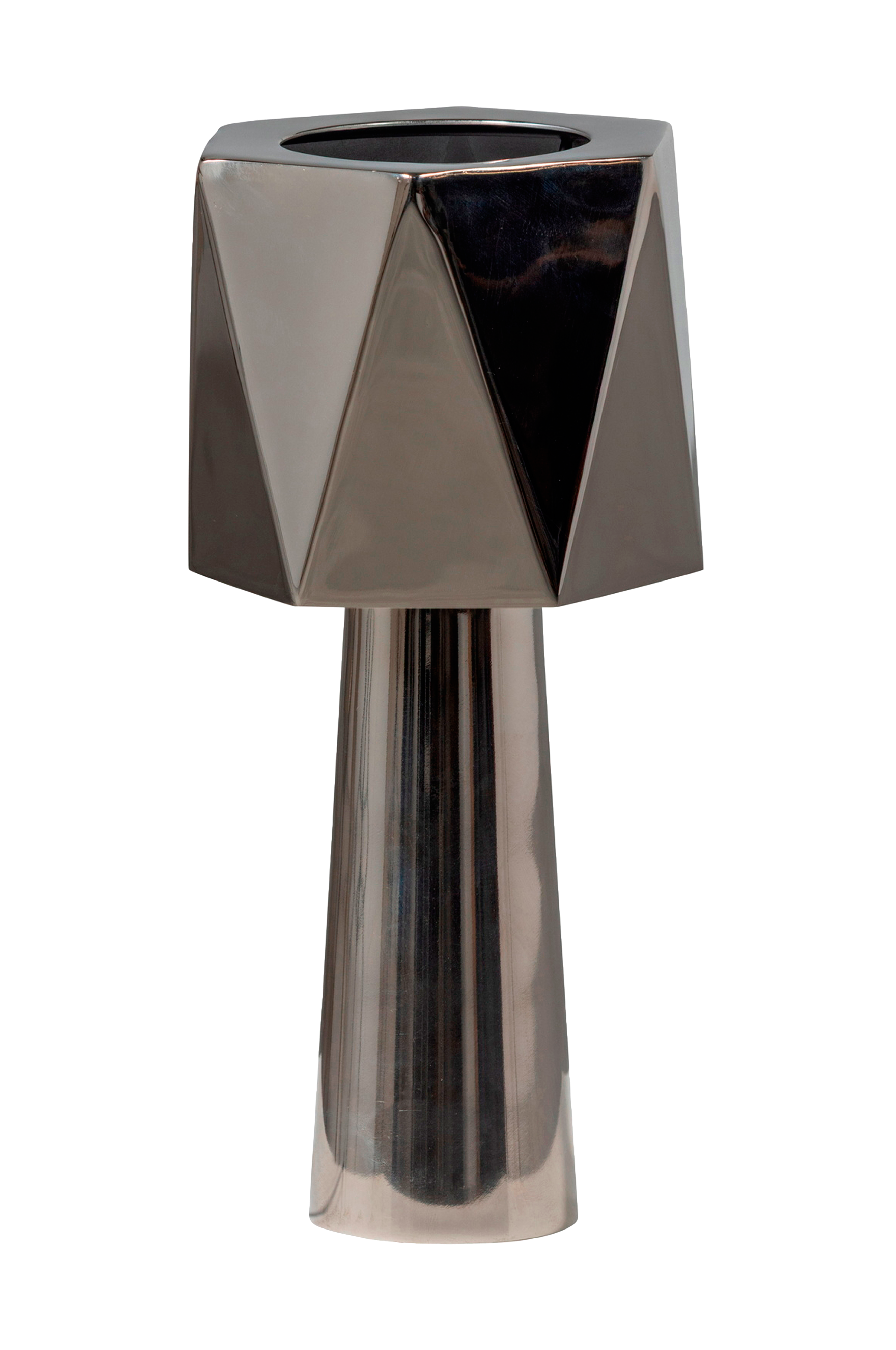 Tämä ainutlaatuinen pöytävalaisin on peräisin hollantilaisen sisustussuunnittelubrändin WOODin mallistosta. Kompakti kooltaan mutta näyttävä ulkonäöltään, tämä katseenvangitsija takaa huomion. Leikkisä geometrinen muotoilu kiiltävässä kromivärisessä metallissa antaa lampulle modernin ja ylellisen ilmeen. Olipa valo päällä tai pois päältä, tämä lamppu tuo aina luonnetta sisustukseesi.