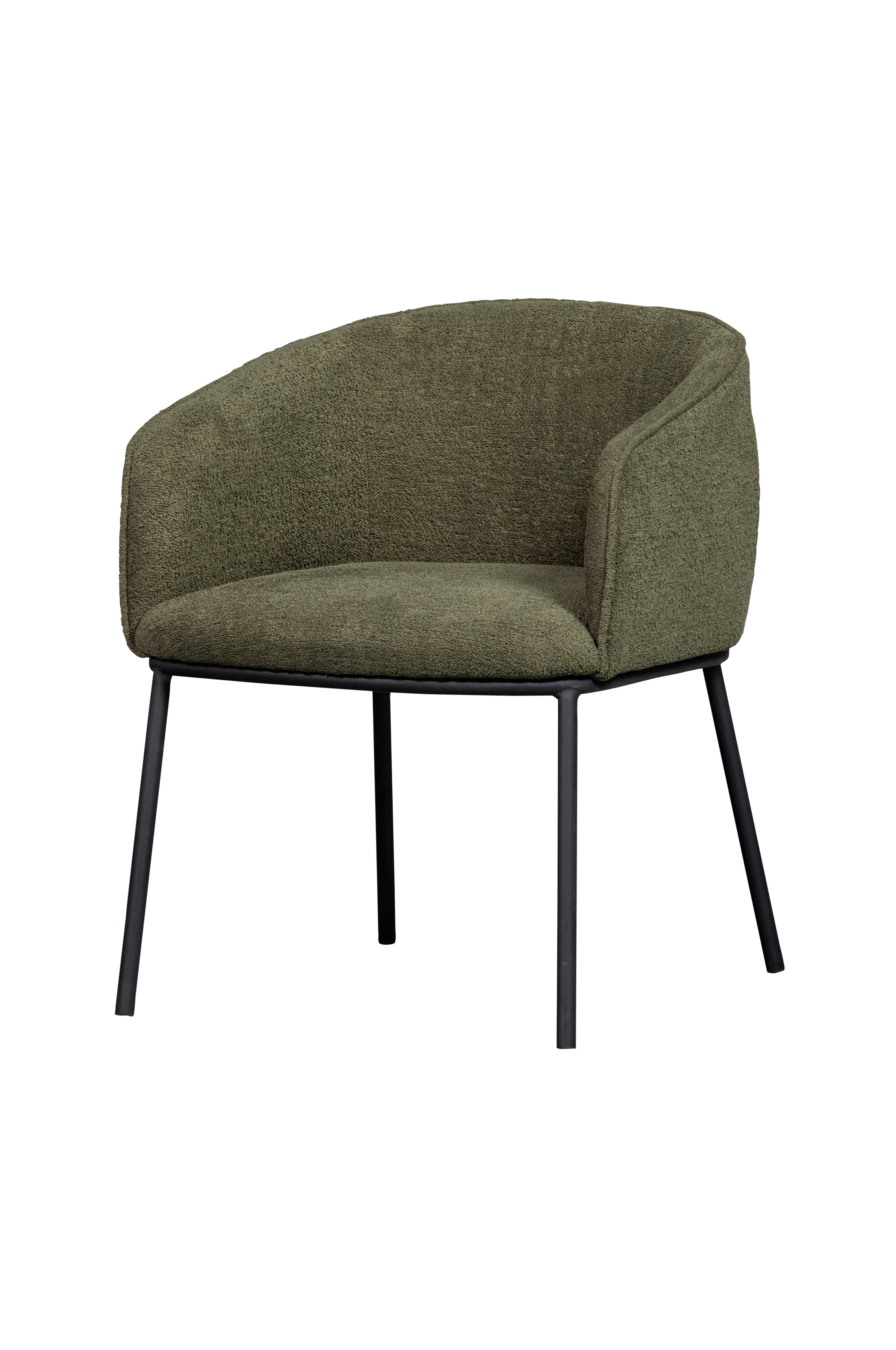 hollantilaisen sisustusbrändin wooodin mallistoon kuuluvassa Leon-ruokatuolissa on hienovarainen ammeenmuotoinen istuin, joka on verhoiltu lämpimällä bouclé-kankaalla. Kartiomainen metallijalka antaa tuolille ilmavan ilmeen.