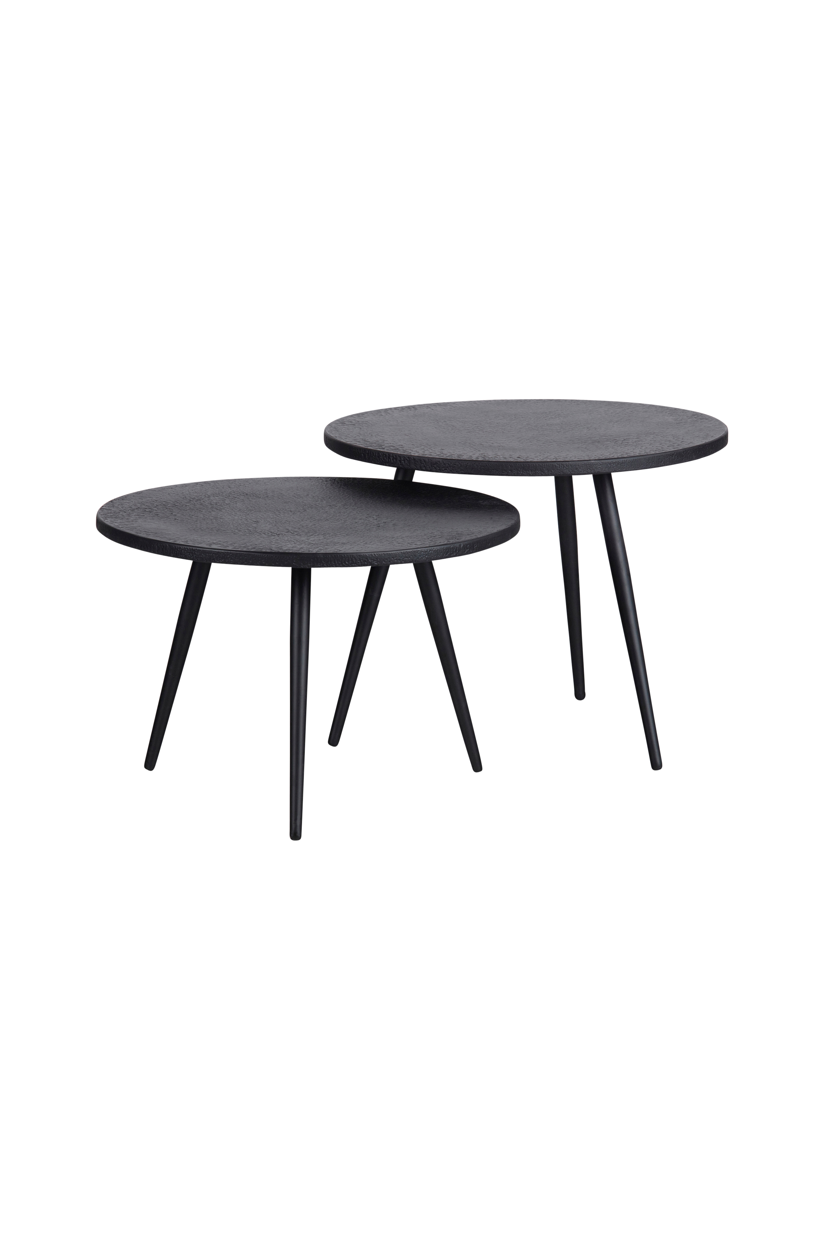 Hollantilaisen tuotemerkin Woood malliston Suze-sivupöydän kahden hengen setti muodostaa leikkisän parin. Pöytätasot on muotoiltu vahvasta vanerista ja viimeistelty metallipinnoitteella, joka antaa vedenpitävän kerroksen. Metallijalat ovat muodoltaan ohuet ja ne on viimeistelty mattamustaksi.