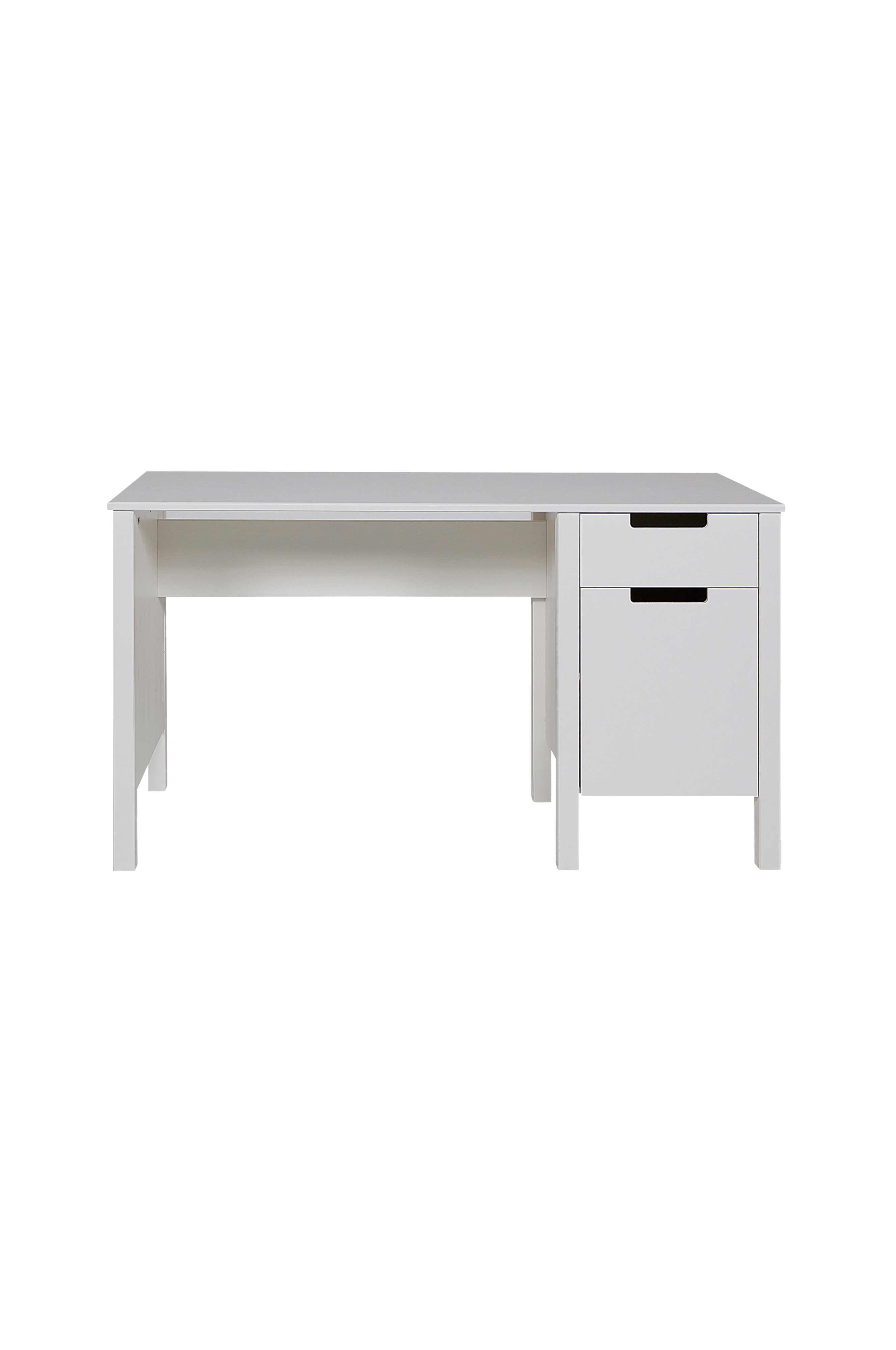 Skrivbordet Jade har en låda och bakom skåpsdörren finns förvaringsfack. Skrivbordet är tillverkat av massiv tall i färg.
