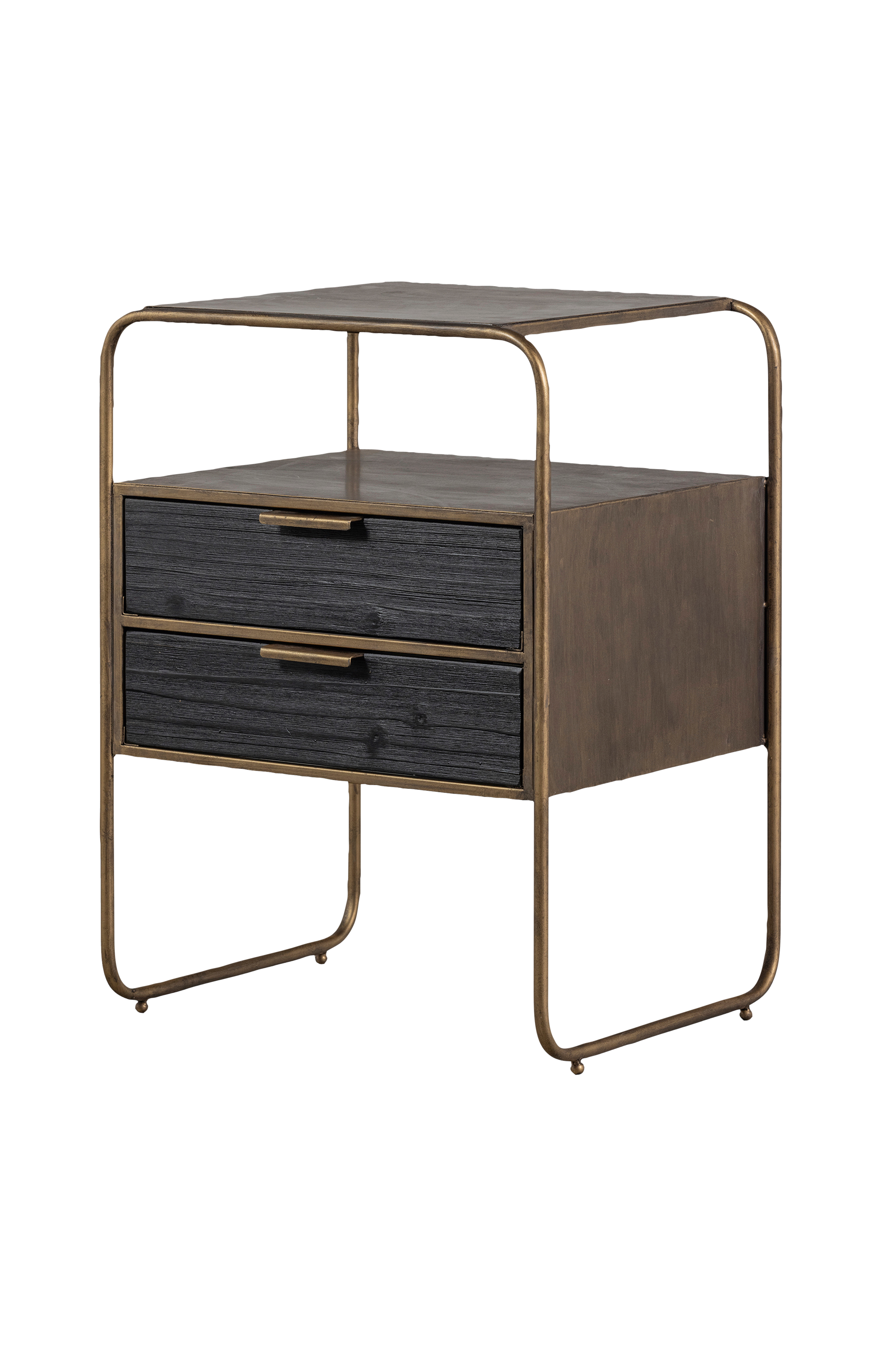 Yöpöydän korkeus on 62 cm. U:n mallisten jalkojen korkeus on 22,5 cm ja halkaisija 1 cm. Puisissa laatikoissa ei ole liukukiskoja. Laatikon etulevyn mitat ovat 10 x 40 cm (k x l) ja paksuus 1,5 cm. Laatikoiden korkeus on 8 cm, leveys 37,5 cm ja syvyys 32 cm. Pöytätason leveys ja syvyys 36 cm. Välihyllyn korkeus 14 cm.