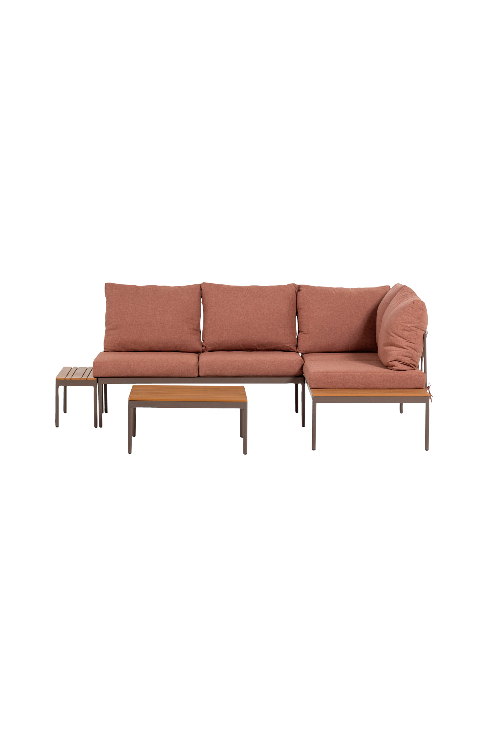 metallirunko takaa tukevuuden ja vakauden, kun taas ulkoverhoilu on kehitetty erityisesti ulkokäyttöön. Olefiinikangas on vahva, huoltoystävällinen materiaali, joka kestää kosteutta ja uv:ta, mikä takaa värien pysymisen elinvoimaisina pitkään. Pehmeän kuidun ansiosta se sopii erinomaisesti intensiiviseen päivittäiseen käyttöön. Sen kevyt luonne tekee osien siirtämisestä helppoa.