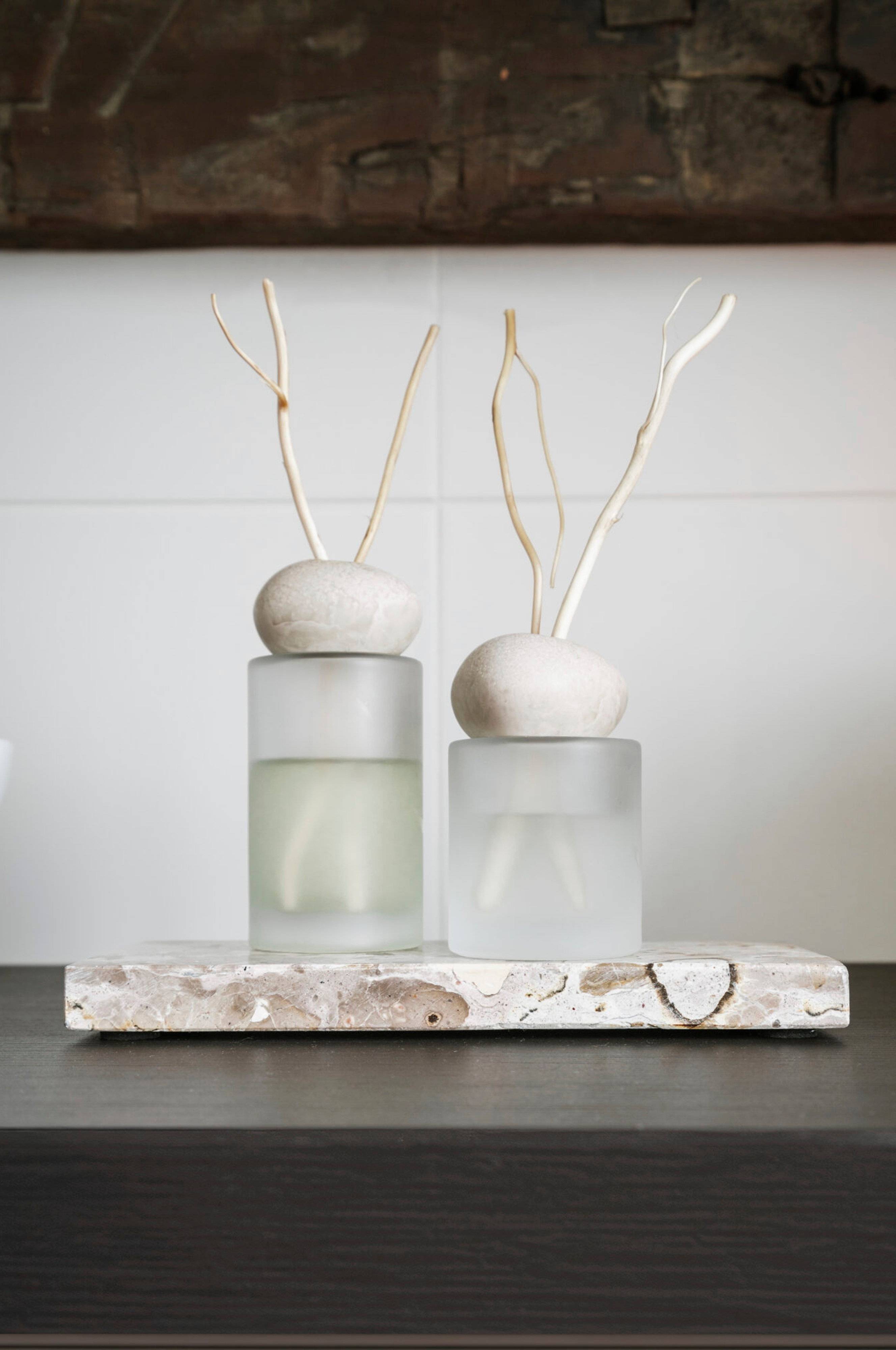 Diffuusori himmeässä lasipullossa, jossa on etiketti ja koristeellinen kivipallo. Ainutlaatuiset korallia muistuttavat neulepuikot. Pionin & mandariinin kukan ja hunajan tuoksu. 200 ml. Kesto enintään 3 kuukautta.