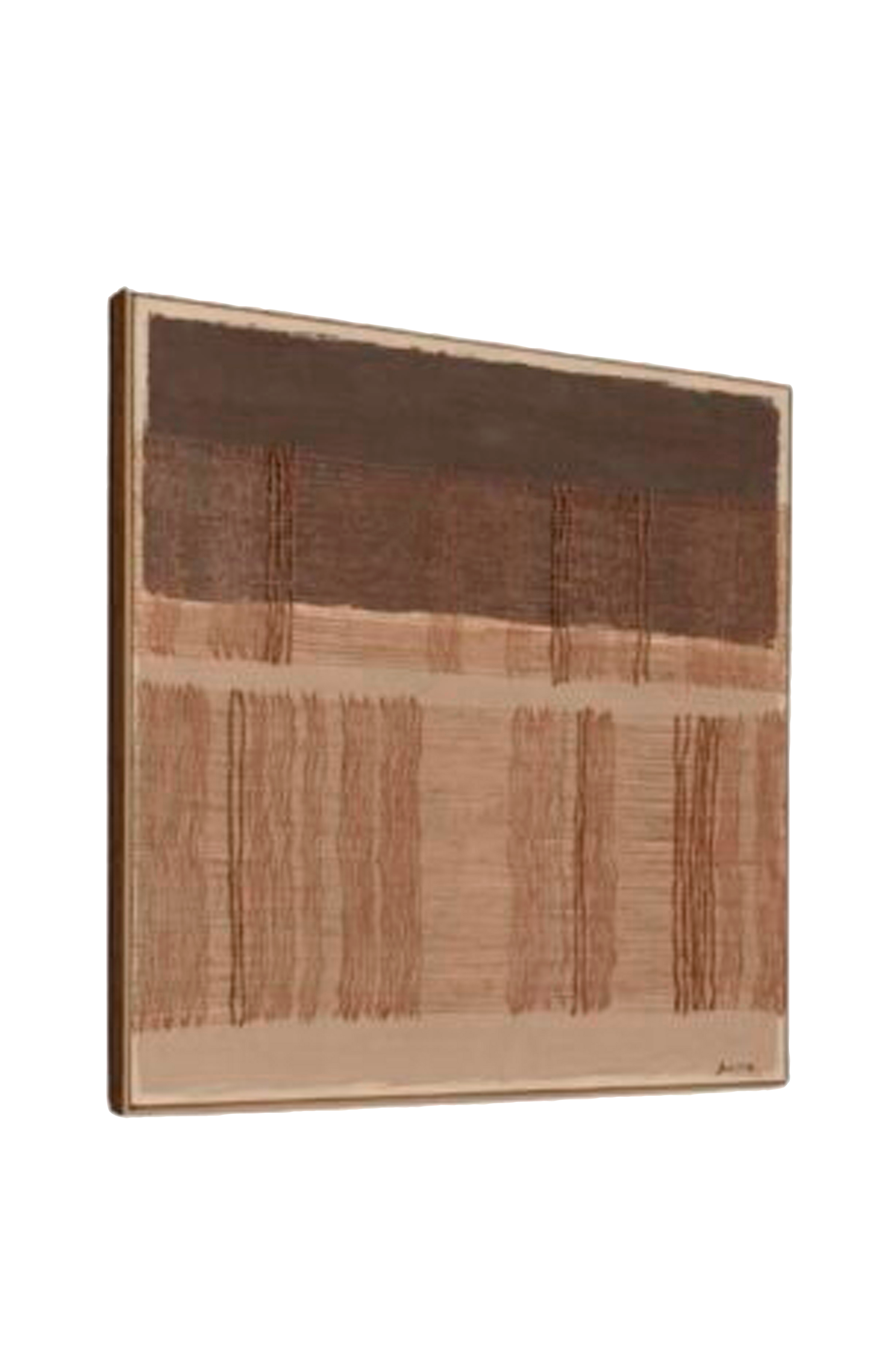 Käsin maalattu kangas ja luonnollinen puukehys. Abstrakti kangaspainatus, jossa on kerroksittain siveltimeniskuja neutraaleilla väreillä, jotka luovat kuvioidun kuvion vaalealla taustalla. Kaunis teos koristamaan seinääsi.