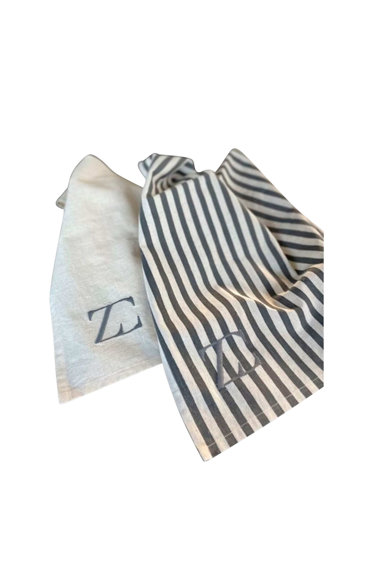 2 keittiöpyyhkeen sarja. Yksi klassinen raidallinen beige keittiöpyyhe puuvillaa, jossa on raitoja ja zbh-logo. Yksi yksivärinen keittiöpyyhe puuvillaa, jossa on zbh-logo.