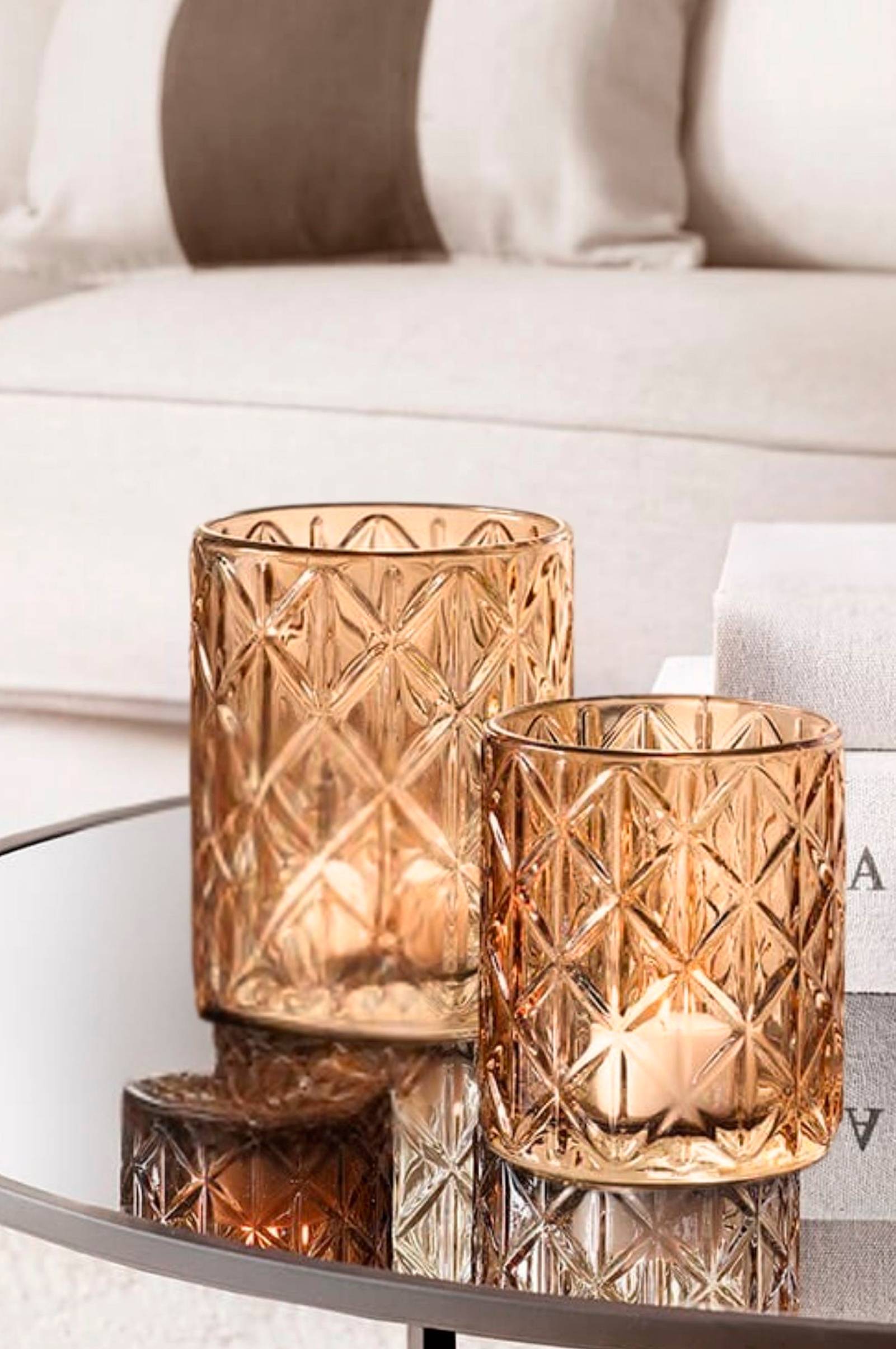 Optisesta lasista valmistetut lyhdyt, joissa on syviä leikkauksia, jotka antavat hohtavan ja kimaltelevan tunnelmallisen valon. Todella ihastuttava setti. Saatavana myös topaasina.