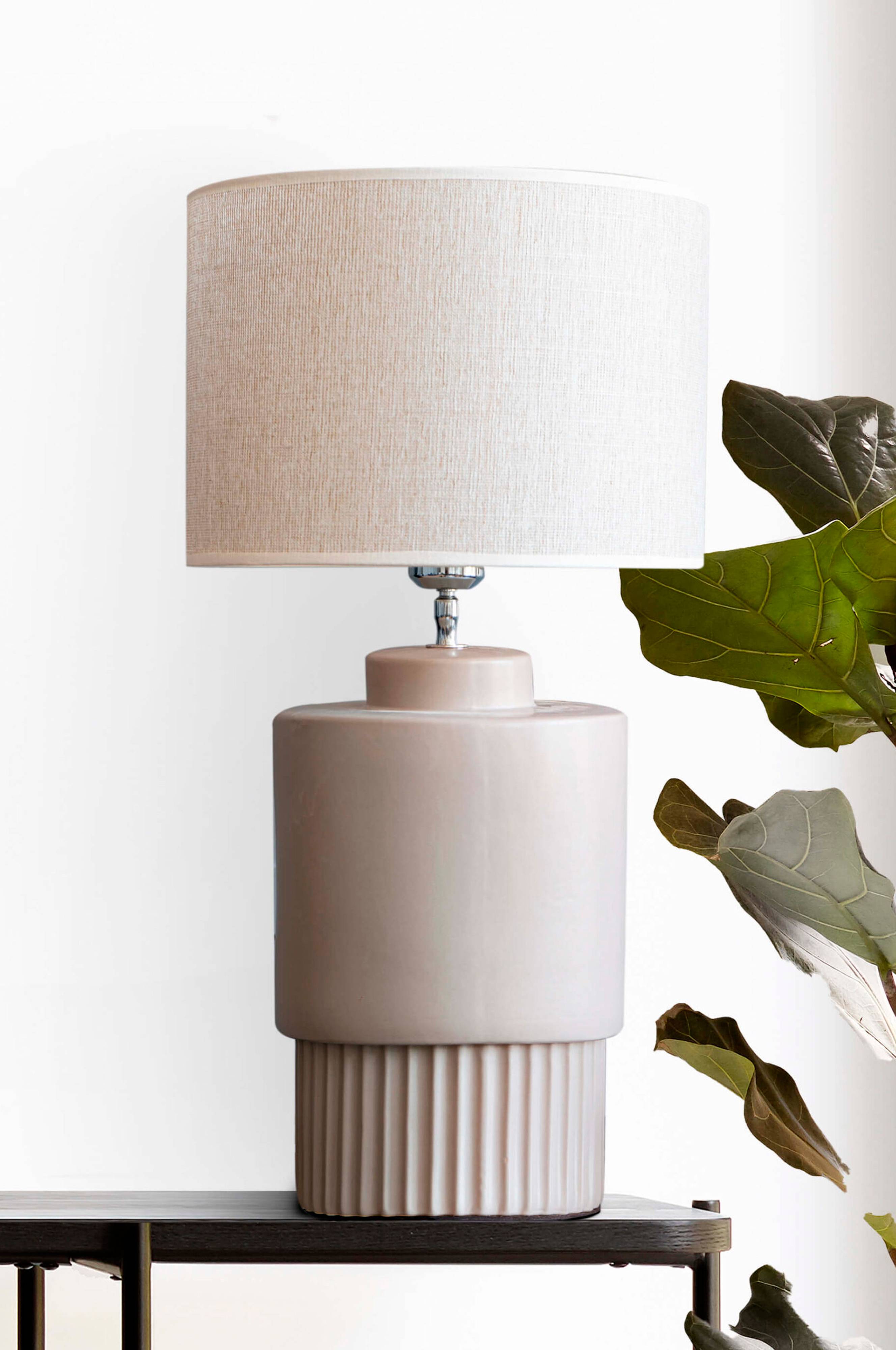 Lampunjalka mattapintaista keramiikkaa. Hieman kapeampi, uurrettu/aaltomainen alaosa ja leveämpi sileä yläosa. Läpinäkyvä johto ja E27-lampunkanta.