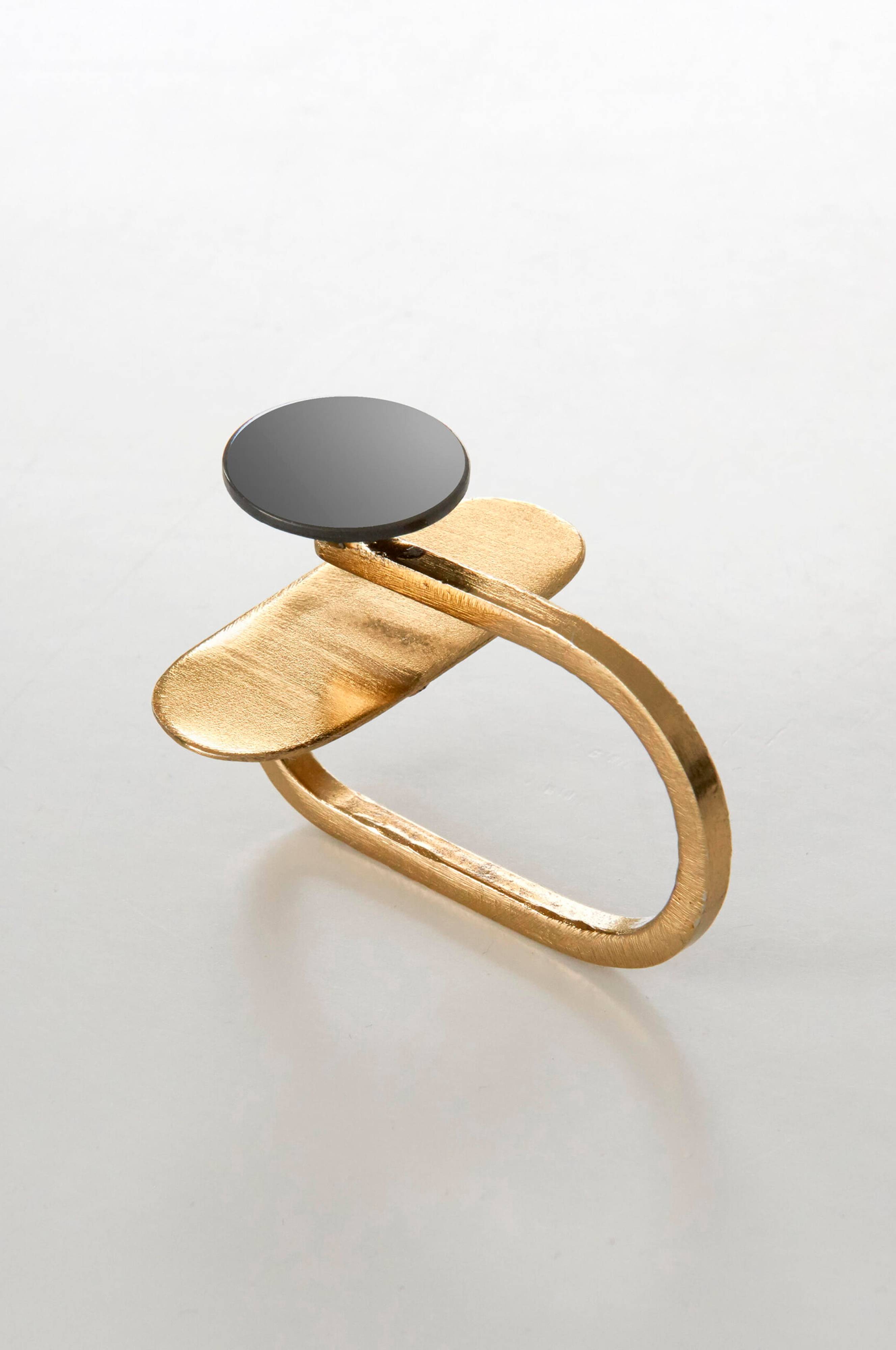 Uniikin muotoinen lautasliinarengas. Kullanväristä metallia ja mustat yksityiskohdat. Sopii hyvin kauniisiin kattauksiin.