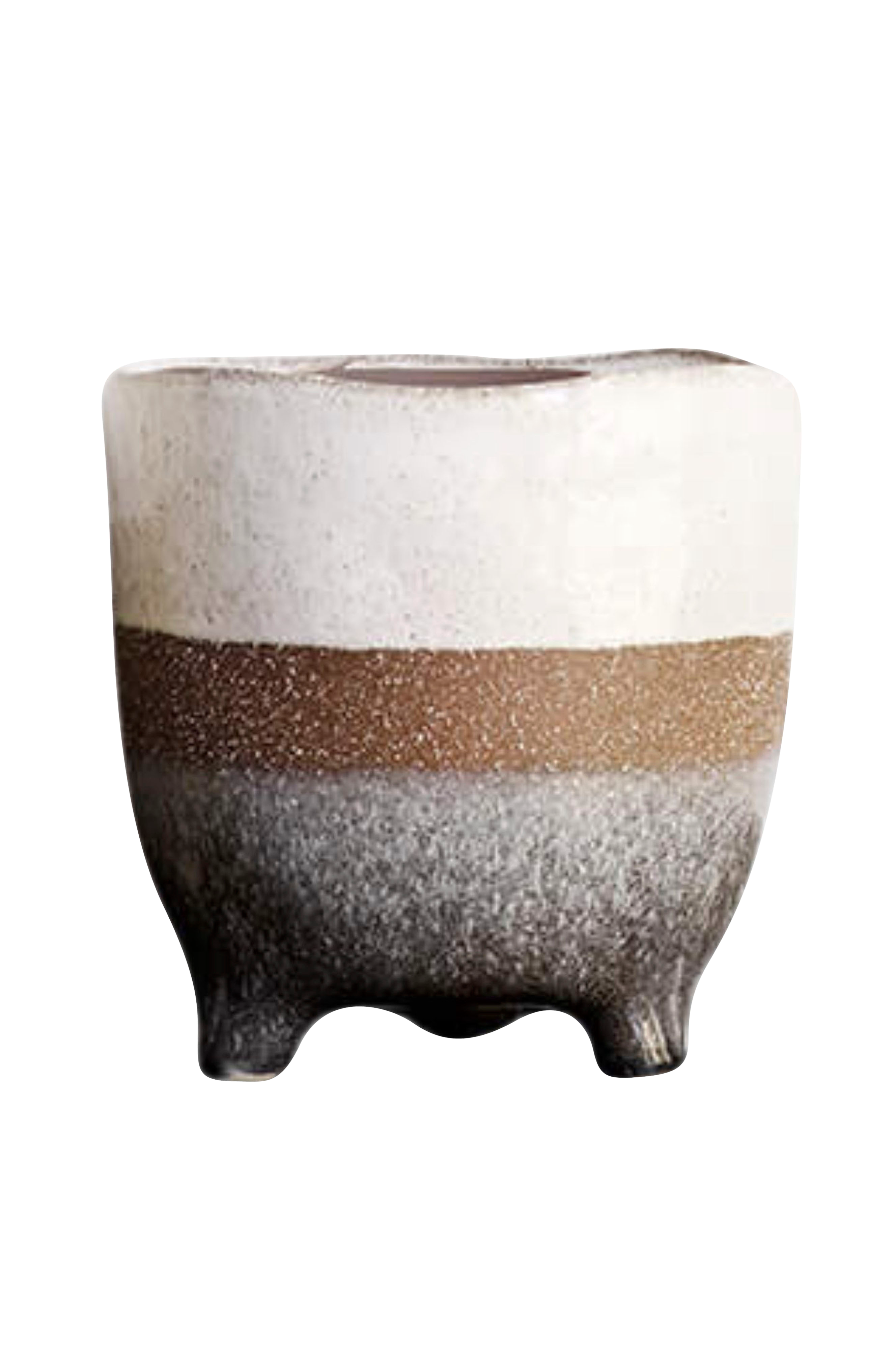 Käsintehty kolmijalkainen ruukku. Hiekkamainen lasite ja epätasainen reuna.