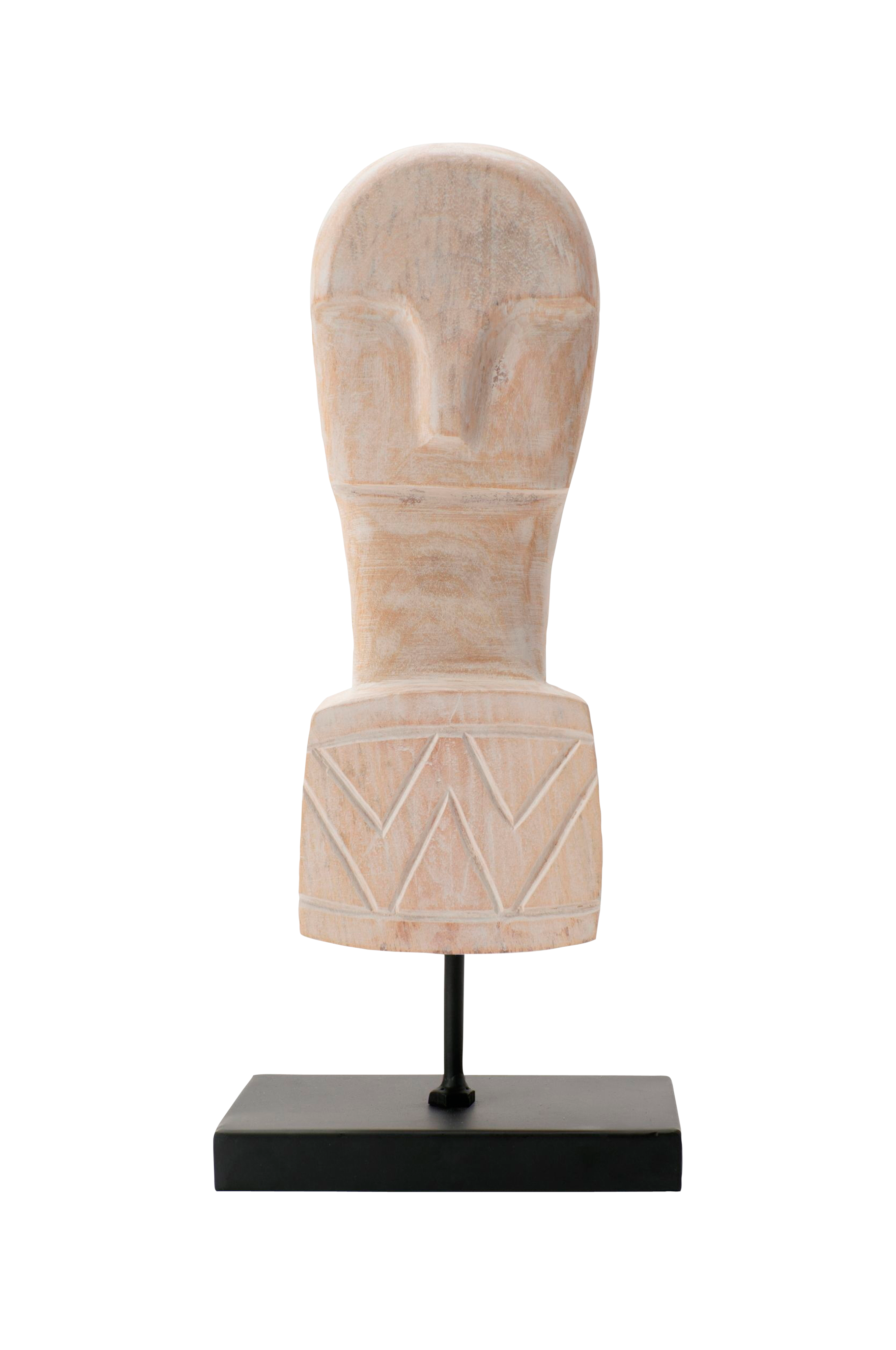 Patsas valkoiseksi kalkittua puuta ja musta metallijalusta