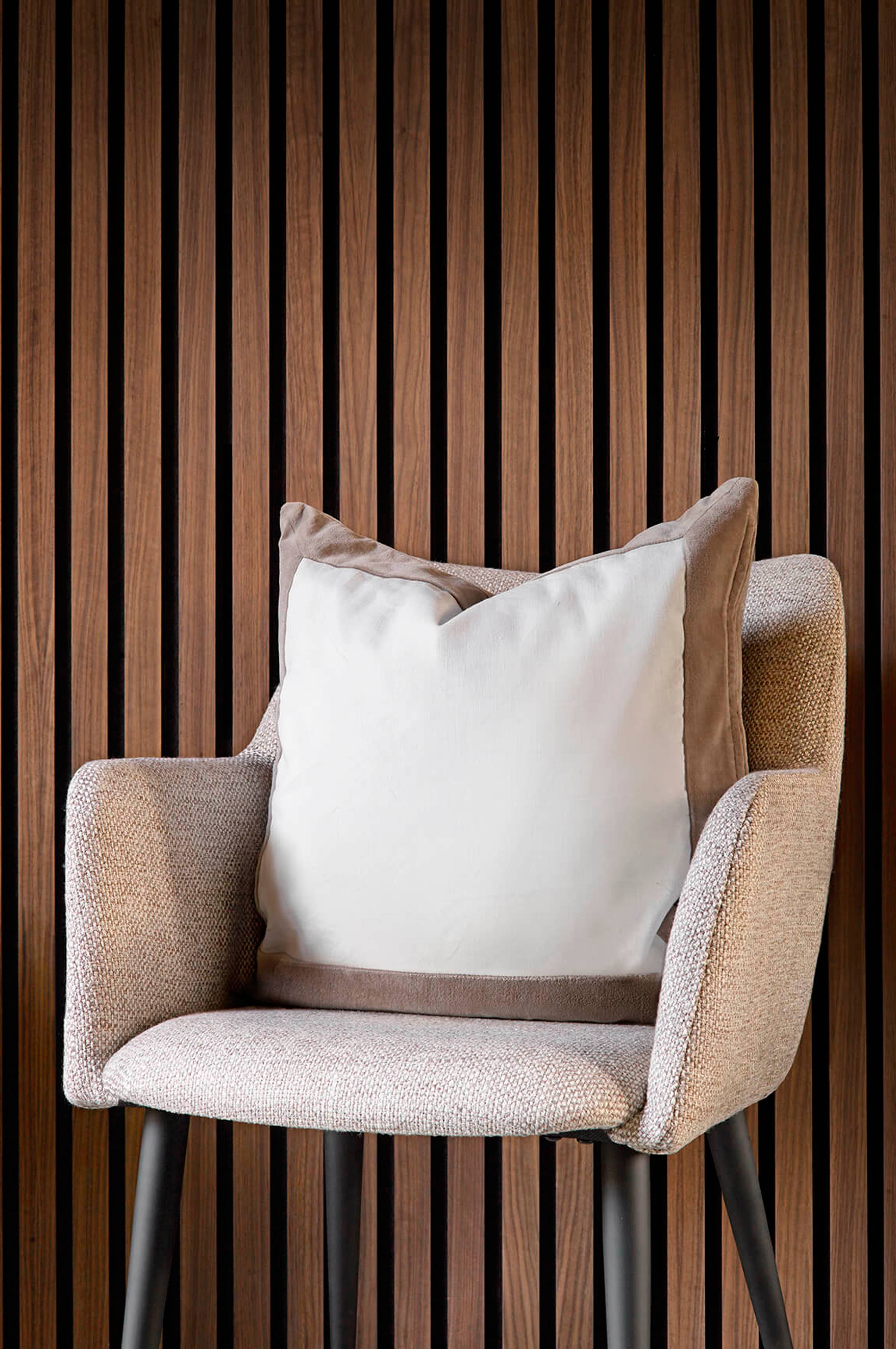 Tyynynpäällinen puuvillaa, jossa ruskeanharmaa ja luonnonvalkoinen sametti- ja pellavastruktuuri. Takaosa ruskeanharmaata samettia.
