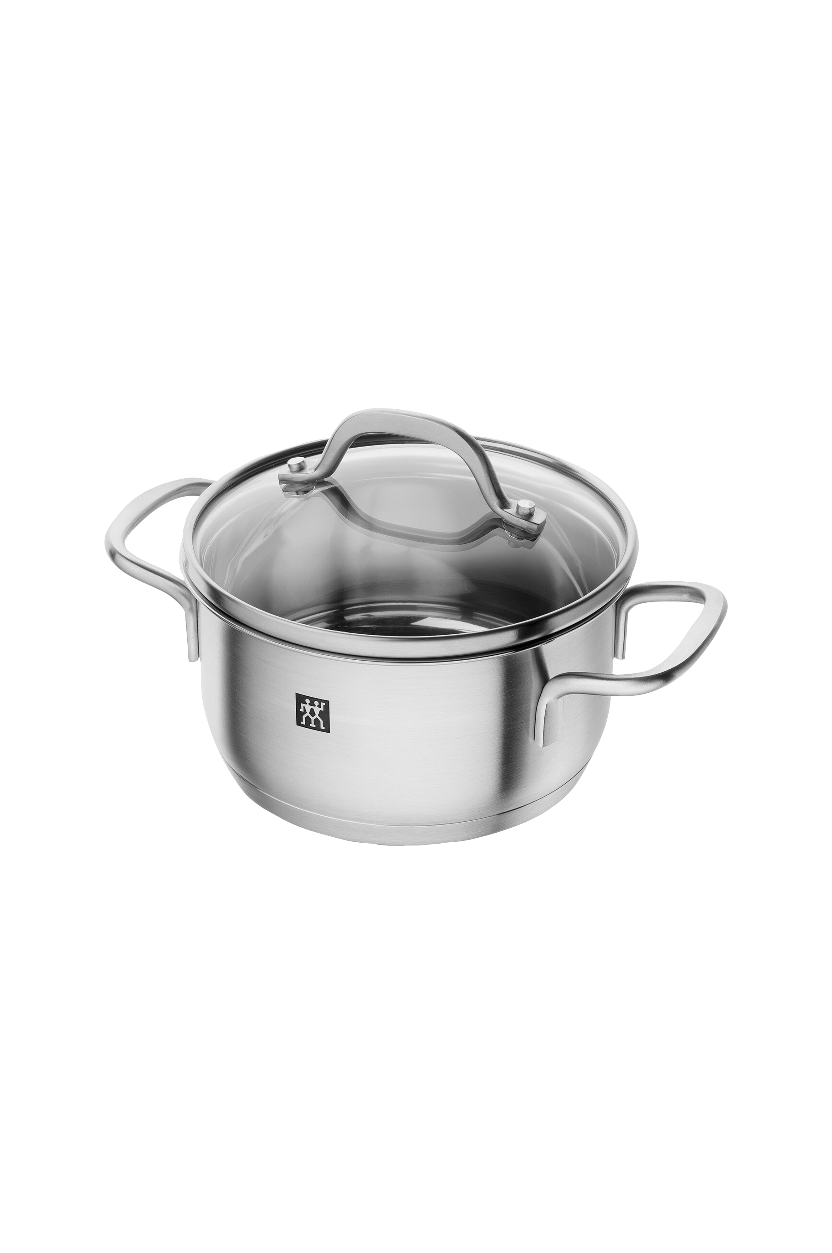 Zwillingin Pico -sarjan pieni kattila, jossa lasikansi. Yleiskattila vie vain vähän tilaa, ja paistamiseen, kastikkeiden valmistukseen ja ruoanlaittoon tarvitaan nyt vain yksi kattila. Sigma Classic -sandwich-pohja, jossa alumiiniydin. Jakaa lämmön nopeasti ja tasaisesti.