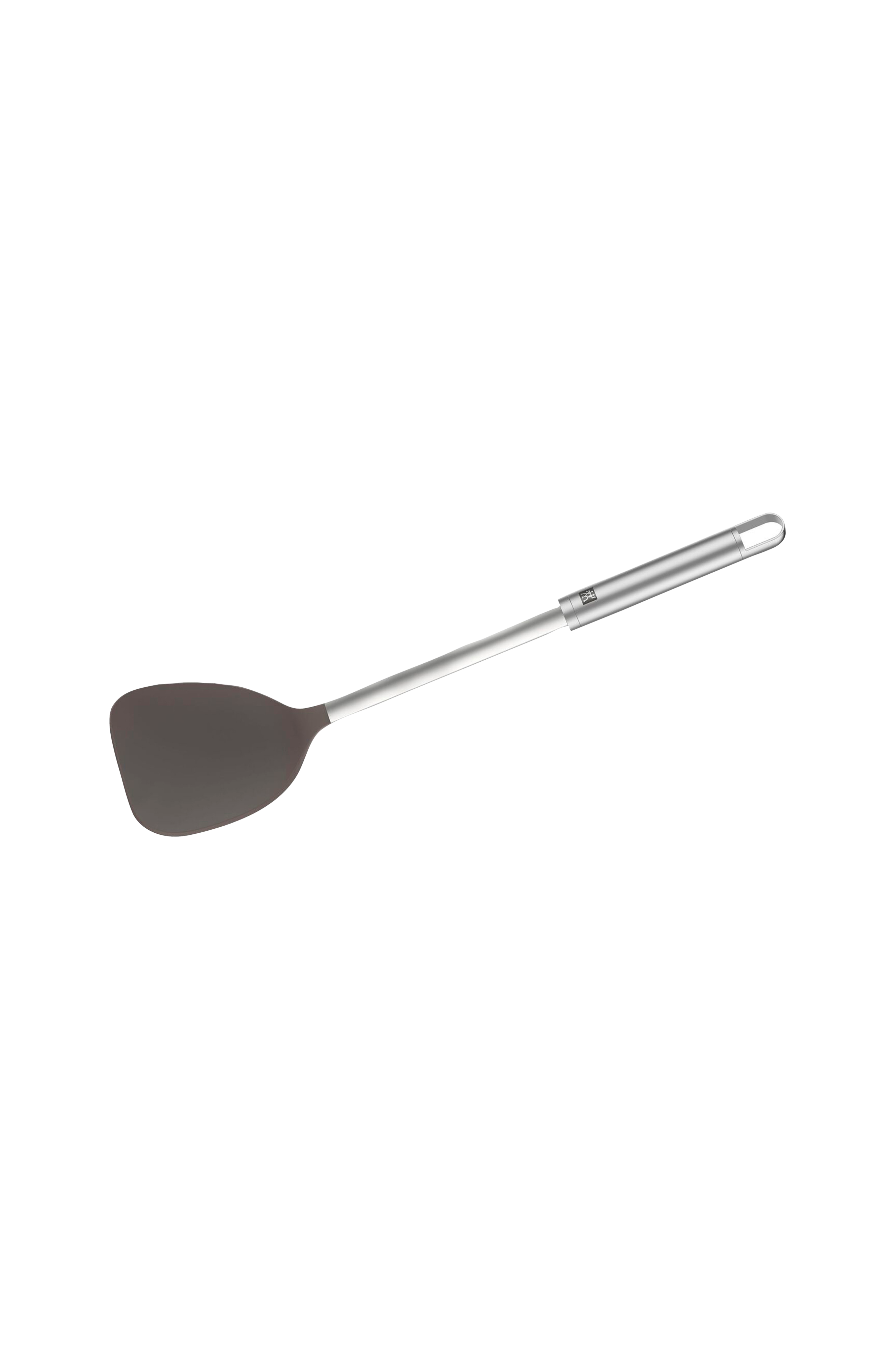 ZWILLING Pro -sarjan wokkilasta. Se sopii ihanteellisesti ainesten paistamiseen tyypillisessä wokkipannussa, jossa tuoreita aineksia paistetaan vain hetki ja käännetään. Helppo käsitellä ergonomisesti muotoillun varren ansiosta. Etuosa on valmistettu lämmönkestävästä silikonista, joka ehkäisee non-stick-pintaa naarmuuntumasta. Kahvan silmukan avulla voit myös ripustaa wokkilastan keittiötankoon. Valmistettu ruostumattomasta teräksestä ja voidaan pestä astianpesukoneessa.